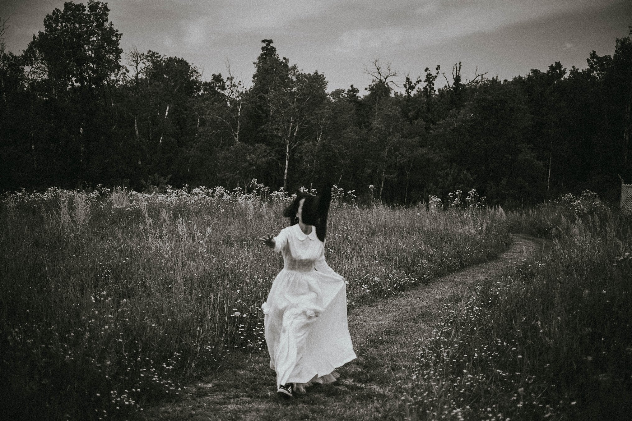 While we started with a cotton sundress, I last minute threw a vintage wedding dress into the back of the car because I had a feeling it would work well with the shoot and wouldn’t ya know it - those were some of my favorite images! After a quick stop to grab some cigarettes (I have a thing for women smoking which is wild since I’ve never smoked anything in my life! But hey, we like what we like!) we ended up outside the city (even past Steinbach!) and at some random natural gas service station with a field and forest. So, we decided on “JILTED BRIDE” as the theme for the shoot and had fun making it come to life!